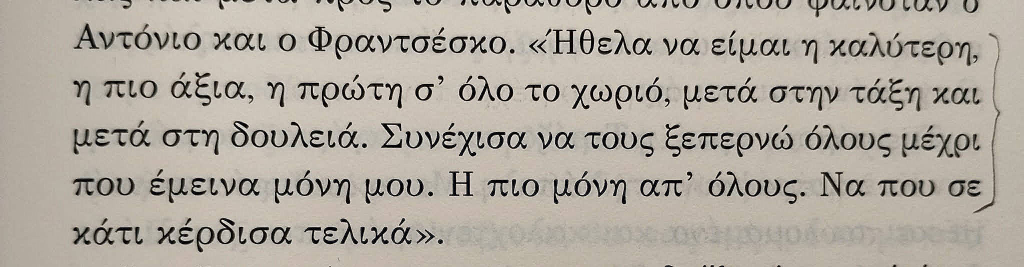 «Την Κυριακή το πρωί πηγαίναμε στην εκκλησία. Ήταν απαράβατος κανόνας για όλα τα χωριά σαν το δικό μας: εκκλησία και φασισμός. Όπως και να ‘χε, έπρεπε να εξαρτιόμαστε από κάτι ή από κάποιον: άνθρωποι φοβισμένοι, άρα διαχειρίσιμοι.»