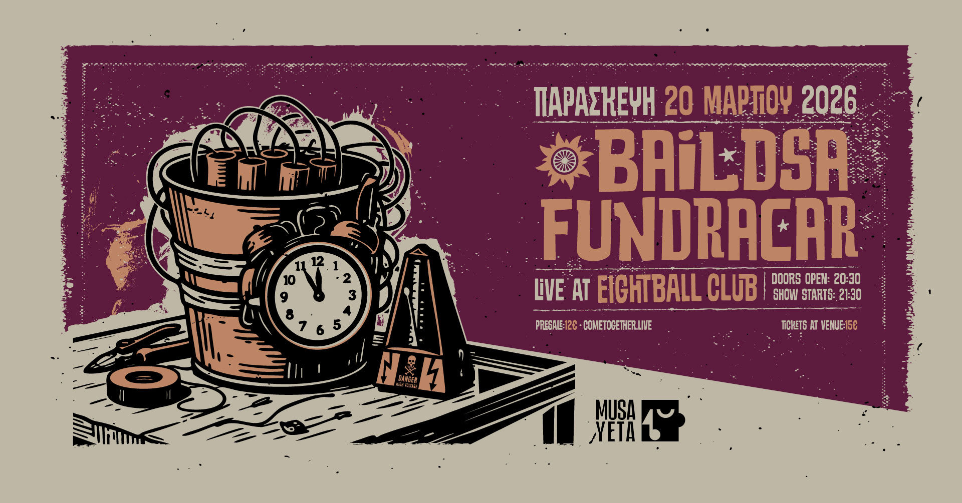 Οι Baildsa και Fundracar ενώνουν για πρώτη φορά τις δυνάμεις τους στη σκηνή του Eightball Club, σε ένα live που υπόσχεται ένταση, ενέργεια και απρόβλεπτες στιγμές. Λίγο πριν τη συναυλία της 20ης Μαρτίου, οι δύο μπάντες μιλούν για τη σχέση τους με τη σκηνή, την ελευθερία στον ήχο και το ιδιαίτερο vibe των live στη Θεσσαλονίκη